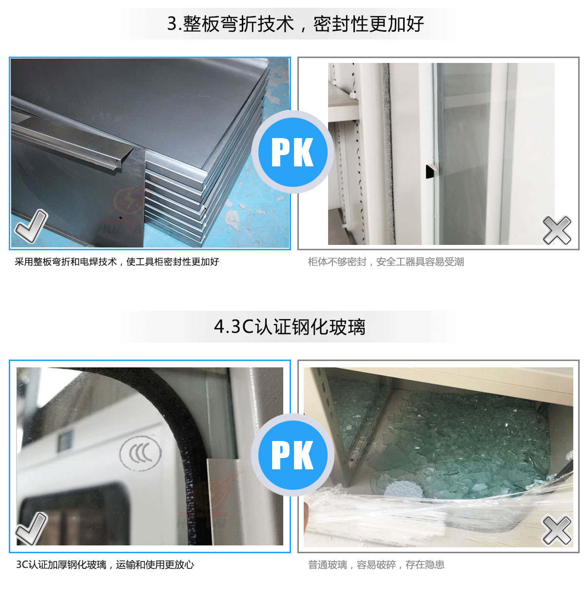 (2)柜體表面為靜電防腐噴塑工藝,顏色為駝灰色,柜門裝有通體透明鋼化玻璃,透過玻璃門可以看到分類有序的各種工器具,便于您的管理。